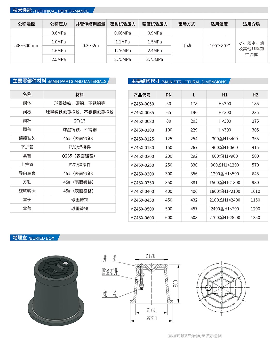 直埋式軟密封閘閥由閥門(mén)、地埋裝置(包括伸縮桿、伸縮護(hù)套、地埋盒)等部分組成。其閥門(mén)部分除了具有軟密封閘閥的所有特點(diǎn)之外,還具備先進(jìn)的烤漆層防腐技術(shù),閥體不會(huì)生銹,確保三十年免維護(hù)。由于軟密封閘閥使用壽命長(zhǎng),性能穩(wěn)定,在軟密封閘閥基礎(chǔ)上添加了一個(gè)伸縮桿、伸縮護(hù)套,并配以地埋盒,形成直埋式軟密封閘閥,特點(diǎn)如下: